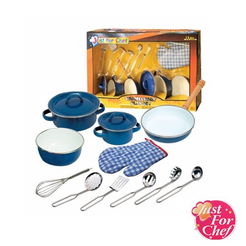 Sản phẩm gồm 1 chiếc bao tay màu xanh sọc caro, 1 dụng cụ đánh trứng, 5 môi, thìa, muỗng các loại, 1 cái chảo, 1 cái chén, 2 nồi nhỏ có nắp đậy. Màu xanh tọa cảm giác sạch sẽ, mát mẻ khiến trẻ có cảm giác thích được sử dụng. Bố mẹ có thể chơi cùng bé từ đó tạo thêm gắn kết gia đình và hiểu nhau hơn.