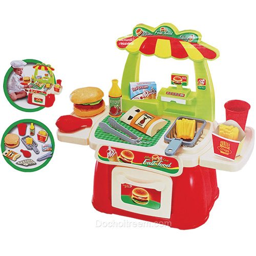 Đồ chơi nấu ăn Hộp bàn bếp làm bánh Hamburger có màu đỏ nổi bật, đi kèm là các đồ dùng nhà bếp như: máy tính tiền, ly, nước ép, muỗng, nĩa, bao tay, đồ chiên khoai tây, bột làm kem, thực đơn, tiền đô… Với các đồ dùng có sẵn, các bé có thể làm nên những chiếc bánh hamburger đặc biệt, các thức ăn nhanh và các phụ kiện khác. Các bé có thể vui chơi cùng bạn bè bằng các trò chơi như: mua hàng, bán hàng, hay nhập vai thành những người khách đang thưởng thức món hamburger thơm ngon.
